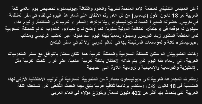 Comme on peut le lire dans le texte ci-dessus (sic), l’arabe est parlé dans le monde par 422 millions de personnes, mais il semble que, pour le moment, cette journée soir célébrée essentiellement dans les pays qui parlent la langue arabe.